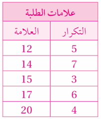 يبين الجدول المجاور علامات مجموعة من الطلبة في اختبار مادة الرياضيات نهايته العظمى 20 أنظم البيانات في جدول تكراري.
