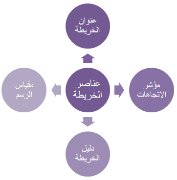 عنوان الخريطة، مؤشر الاتجاهات، دليل الخريطة، مقياس الرسم.