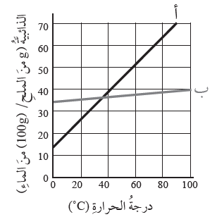 2- يمثل الشكل المجاور العلاقة بين درجة الحرارة وذائبية الملحين (أ)، و(ب). أدرسُهُ، ثم أجيب عن الأسئلة الآتية: