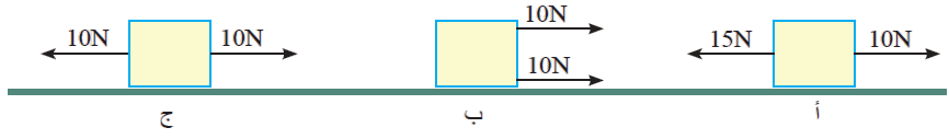 صندوق موضوع على سطح أفقي أثرت فيه قوتان في ثلاث حالاتٍ (أ ، ب ، ج) كما في الشكل، أجد القوة المحصلة في كل حالةٍ.