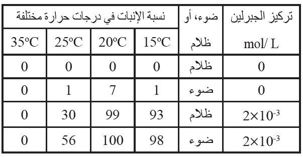 بعد ذلك عرّض نصف العينات المغمورة بالماء ونصف العينات المغمورة بمحلول الجبرلين لضوء أحمر مدة 60 s ، ثم عرّضها لدرجات الحرارة الآتية: