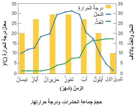 ب- أصف التغيرات في أعداد جماعتي النحل والعث الحيويتين من شهر نيسان إلى شهر تشرين الأول.