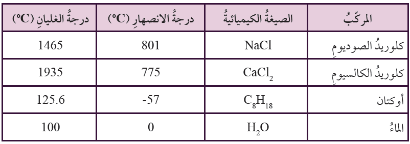 يبين الجدول الآتي درجات انصهار وغليان بعض المركبات الأيونية والجزيئية (التساهمية):