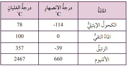 أيهما يصلح لقياس درجة غليان الماء: مقياس الحرارة الكحولي أم الزئبقي؟ أفسّر إجابتي، اعتماداً على البيانات الواردة في الجدول المجاور.