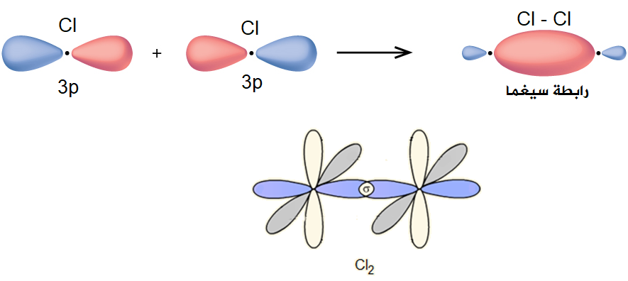 عند اقتراب فلكين ذريين نصف ممتلئين من نوع 3p من ذرتي كلور، تتشكل رابطة تساهمية أحادية، وبما أن الرابطة التساهمية أحادية فإنه من المتوقع حدوث تداخل رأسي بين فلكي p من الذرتين.