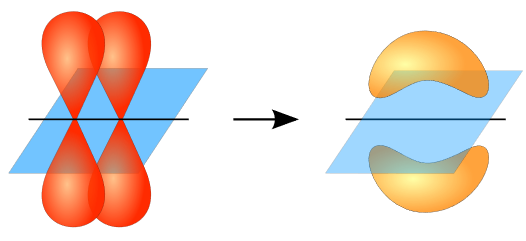 ) تتشكلان من التداخل الجانبي لفلكي 2p الآخرين من كلتا الذرتين، وتتوزع الكثافة الإلكترونية في كلتا الرابطتين في منطقتين على جانبي الخط الواصل بين النواتين.