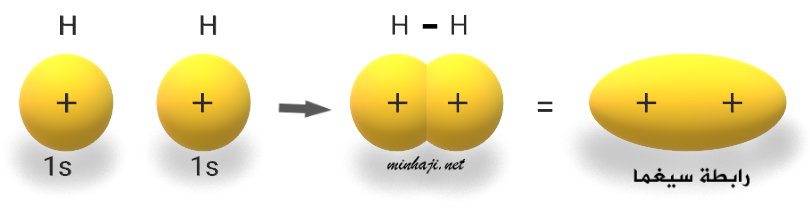 عند اقتراب فلكين ذريين نصف ممتلئين من نوع 1s من ذرتي هيدروجين تتشكل رابطة تساهمية أحادية، ومن المتوقع أن يتواجد الإلكترونين في المنطقة بين النواتين، إذ يخضع كل منهما لقوة جذب نواتين في آن واحد، لذلك تزداد الكثافة الإلكترونية بين النواتين على طول المحور الواصل بين نواتي الذرتين المرتبطتين، وتتكون رابطة تساهمية قوية من نوع (
