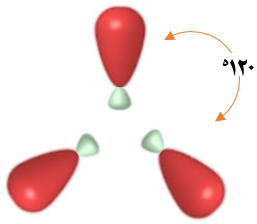 تتجه الأفلاك المهجنة في الفراغ بثلاث اتجاهات بحيث يكون التنافر بين إلكتروناتها أقل ما يمكن وتأخذ الأفلاك شكل مثلث مستوٍ، والزاوية 120o