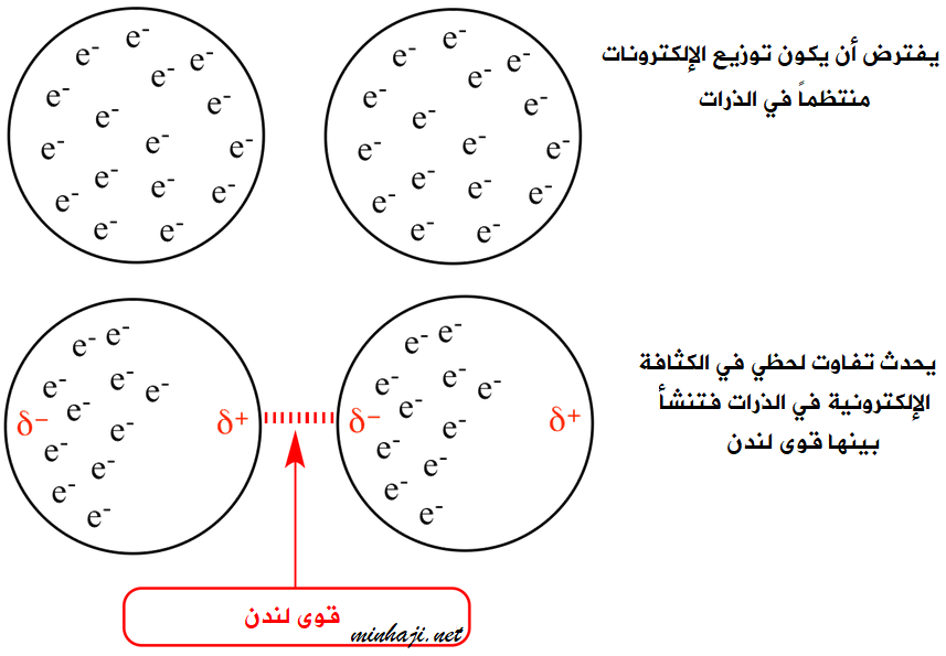 ويسمى هذا التوزيع غير المنتظم للشحنات ثنائي القطب اللحظي، ويؤثر ثنائي القطب اللحظي في الذرات المجاورة ويجعلها مستقطبة بالحث، فينشأ عن ذلك قوى تجاذب فيما بينها يعرف بقوى لندن.