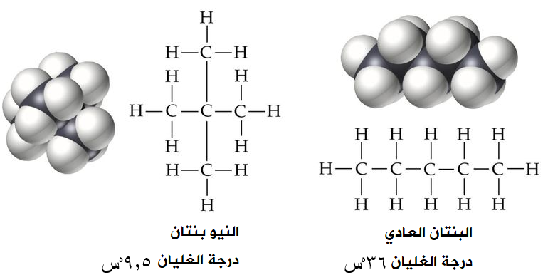يشترك البنتان العادي والنيوبنتان (ثنائي ميثيل بروبان) في الصيغة الجزيئية C5H12 ، وعلى الرغم من تشابههما في الكتلة المولية وكونهما غير قطبيين إلا أن درجة غليان البروبان العادي أعلى، فكيف تفسر ذلك؟