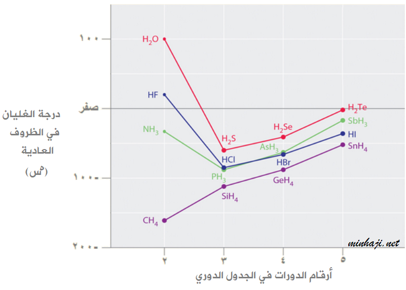 أدرس الشكل الذي يمثل درجات غليان مركبات الهيدروجين مع عناصر المجموعات: الرابعة، والخامسة، والسادسة، والسابعة من الجدول الدوري، ثم أجب عن الأسئلة التي تليه.