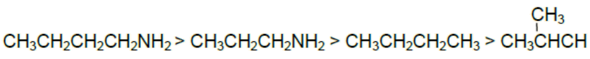 درجة غليان المركب CH3CH2CH2CH2NH2 أعلى من درجة غليان المركب CH3CH2CH2NH2 فكلاهما تترابط جزيئاته بروابط هيدروجينية إلا أن الكتلة المولية للمركب الأول أعلى من الثاني.