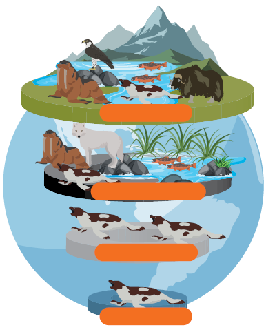 من الأعلى إلى الأسفل: النظام البيئي، المجتمع الحيوي، الجماعة الحيوية، الكائن الحي.