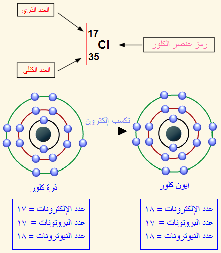 عنصر الكلور من اللافلزات، ويحتوي على (7) إلكترونات في مستوى الطاقة الخارجي لذرته، وعندما يدخل في تفاعل فإنه يكسب إلكتروناً، وتصبح عدد الإلكترونات السالبة في ذرته أكثر من عدد البروتونات بمقدار (1)، فيتحول إلى أيون سالب شحنته (-1).