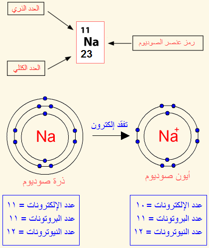 عنصر الصوديوم من الفلزات، ويحتوي على إلكترون واحد في مستوى الطاقة الخارجي لذرته، وعندما يدخل في تفاعل فإنه يفقد ذلك الإلكترون، وتصبح عدد البروتونات الموجبة في ذرته أكثر من عدد الإلكترونات بمقدار (1)، فيتحول إلى أيون موجب شحنته (+1).