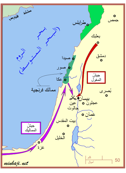 - تبعهم جيش المماليك ودارت بينهم وبين المغول معركة عين جالوت سنة 1260م، والتي انتهت باتصار المسلمين، وتوقف الزحف المغولي.