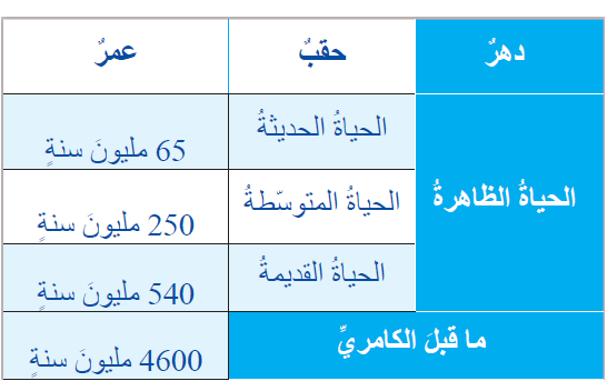 أستخدم الأرقام: أحسب نسبة زمن ما قبل الكامبري من تاريخ الأرض، مستعيناً بالجدول الآتي.