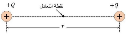 الحالة الأولى: شحنتان متماثلتان ومتساويتان. بتطبيق قانون كولوم نجد أن نقطة التعادل تقع على الخط الواصل بين الشحنتين، وفي منتصف المسافة بينهما.