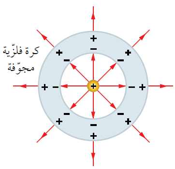 أحلل الشكل: وضعت شحنة نقطية موجبة في مركز كرة فلزية مجوفة ومتعادلة كهربائياً؛ فشحنتها بالحث كما في الشكل المجاور. أصف ما حدث لتوزيع الشحنات على الكرة، وأصف المجال الكهربائي داخل تجويف الكرة وخارجها.