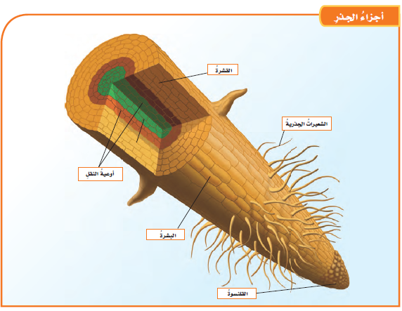 الجذر: جزء من النبات الذي يمتص الماء والأملاح المعدنية من الأرض، ويختزن الغذاء، ويدعم النبات ويثبته في التربة بقوة.