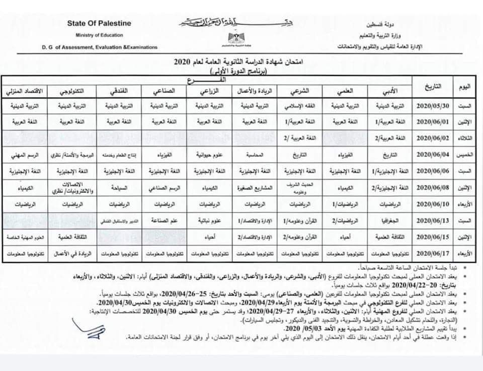 أصدرت وزارة التربية والتعليم الفلسطينية، الجدول الرسمي لامتحانات الثانوية العامة "التوجيهي" للعام 2020 الدورة الأولى.