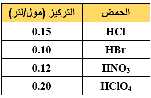 في الجدول أدناه عدداً من الحموض القوية وتركيز كل منها: