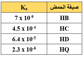 لديك محاليل مائية لأربعة حموض ضعيفة بتراكيز متساوية (0.1 M) لكل منها. بالاعتماد على قيم Ka الواردة في الجدول، صيغة القاعدة المرافقة الأقوى: