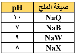 اعتماداً على الجدول أدناه والذي يبين قيم (pH) لعدد من محاليل الأملاح المتساوية التركيز: