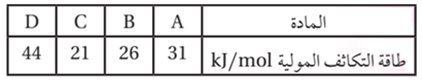 الجدول الآتي يتضمن طاقة التكاثف المولية لأربعة سوائل مختلفة أعطيت الرموز الافتراضية A, B, C, D المادة الأسرع تبخّرًا هي: