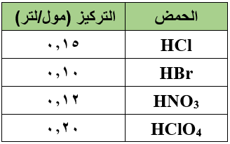 في الجدول أدناه عدداً من الحموض القوية وتركيز كل منها، الترتيب الصحيح لقيم pH لمحاليل الحموض من الأعلى إلى الأقل هو: