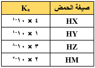 اعتماداً على الجدول أدناه والذي يبين قيم ثابت التأين (Ka) لعدد من الحموض الضعيفة المتساوية التركيز: