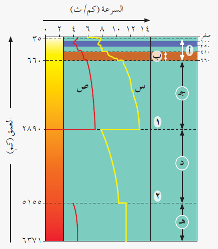 في الشكل أدناه، سلوك الموجات الزلزالية في النطاق (هـ):